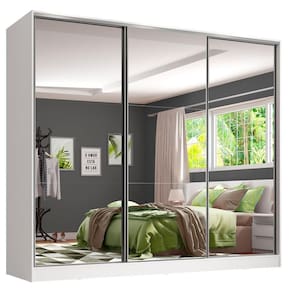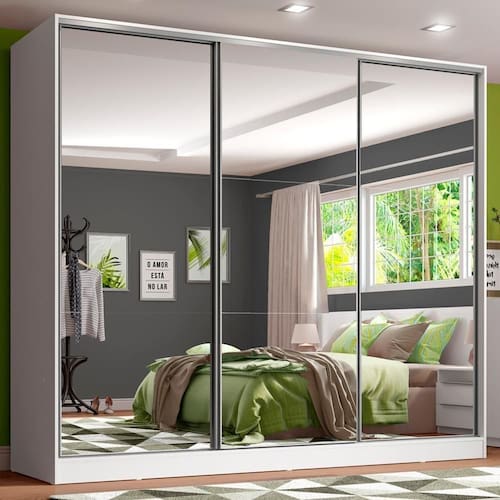 - Itens inclusos: Quatro (4) gavetas internas | Oito (8) prateleiras | Três (3) cabideiros | Três (3) portas de correr com espelhos e sistema anti-descarrilhamento