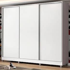 - Itens inclusos: Três cabideiros | Quatro gavetas internas | Oito prateleiras | Três portas de correr com sistema anti-descarrilhamento