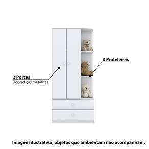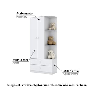 Características: - Branco - Estrutura: Caixa/Interno MDP 12 mm - Frente MDP 15mm - Fundo MDF 3mm - Acabamento: Pintura UV - 2 Portas - 1 Cabideiro de alumínio - 1 Maleiro - 3 Prateleiras - 2 Gavetas - Corrediças Metálicas - Puxador ABS - Cantoneira Decorativa - Peso suportado por gavetas: 3 kg - Peso suportado por prateleira: 8 kg - Marca: Henn