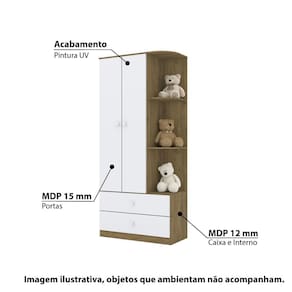 Características: - Rústico/Branco - Estrutura: Caixa/Interno MDP 12 mm - Frente MDP 15mm - Fundo MDF 3mm - Acabamento: Pintura UV - 2 Portas - 1 Cabideiro de alumínio - 1 Maleiro - 3 Prateleiras - 2 Gavetas - Corrediças Metálicas - Puxador ABS - Cantoneira Decorativa - Peso suportado por gavetas: 3 kg - Peso suportado por prateleira: 8 kg - Marca: Henn