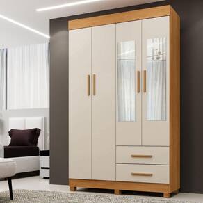 Guarda Roupa Leblon 4 Portas 2 Gavetas 5 Prateleiras Cinamomo Off O Guarda-Roupa Leblon e produzido em chapa de 15 mm que garante robustez e maior vida util, contem 4 portas, 4 prateleiras, 2 gavetas com corredicas telescopica, cabideiro em aluminio, espaco para longos, pes inclusos no produto e puxadores modernos, alem de ter espelho nas portas centrais, otimo custo-beneficio. Sua fabricacao utiliza a linha mdp perffect, que une a sustentabilidade a inovacao tecnologica, proporcionando durabilidade e facil limpeza; inspirando sofisticacao ao mobiliario. Sua pintura UV conta com boa resistencia, e facil de limpar e e ecologicamente correto, pois utiliza madeira de reflorestamento, evitando o desmatamento. Caracteristicas: Material principal: MDP Espessura da chapa: 15 mm Escala de brilho: semibrilho Sistema de montagem: parafuso, cavilha e cantoneiras metalicas Quantidade de Portas: 04 Quantidade de Gavetas: 02 Quantidade de Prateleiras: 04
