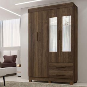 Guarda Roupa Leblon 4 Portas 2 Gavetas 5 Prateleiras Imbuia O Guarda-Roupa Leblon e produzido em chapa de 15 mm que garante robustez e maior vida util, contem 4 portas, 4 prateleiras, 2 gavetas com corredicas telescopica, cabideiro em aluminio, espaco para longos, pes inclusos no produto e puxadores modernos, alem de ter espelho nas portas centrais, otimo custo-beneficio. Sua fabricacao utiliza a linha mdp perffect, que une a sustentabilidade a inovacao tecnologica, proporcionando durabilidade e facil limpeza; inspirando sofisticacao ao mobiliario. Sua pintura UV conta com boa resistencia, e facil de limpar e e ecologicamente correto, pois utiliza madeira de reflorestamento, evitando o desmatamento. Caracteristicas: Material principal: MDP Espessura da chapa: 15 mm Escala de brilho: semibrilho Sistema de montagem: parafuso, cavilha e cantoneiras metalicas Quantidade de Portas: 04 Quantidade de Gavetas: 02 Quantidade de Prateleiras: 04