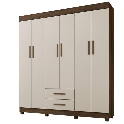 Guarda Roupa Leblon 6 Portas 2 Gavetas 7 Prateleiras Imbuia Off O Guarda-Roupa Leblon e produzido em chapa de 15 mm que garante robustez e maior vida util, contem 6 portas, 7 prateleiras, 2 gavetas com corredicas telescopica, cabideiro em aluminio, espaco para longos, pes inclusos no produto e puxadores modernos, otimo custo-beneficio. Sua fabricacao utiliza a linha mdp perffect, que une a sustentabilidade a inovacao tecnologica, proporcionando durabilidade e facil limpeza; inspirando sofisticacao ao mobiliario. Sua pintura UV conta com boa resistencia, e facil de limpar e e ecologicamente correto, pois utiliza madeira de reflorestamento, evitando o desmatamento. Caracteristicas: Material principal: MDP Espessura da chapa: 15 mm Escala de brilho: semibrilho Sistema de montagem: parafuso, cavilha e cantoneiras metalicas Quantidade de Portas: 06 Quantidade de Gavetas: 02 Quantidade de Prateleiras: 07