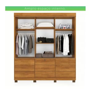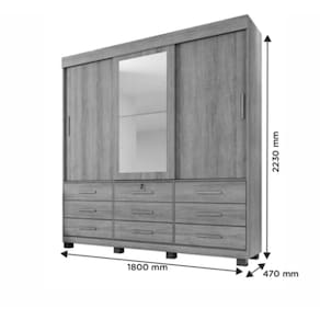 Características: - Produto 100% Chapa 15mm MDP (Robusto) - 4 prateleiras - Espelho Incluso - Kit pés Inclusos - 1 Gaveta com chave - Trilho anti-quedas - Puxadores Madeirados - 9 Gavetas com Corrediças Telescópicas - Cabideiro de Alumínio - Acabamento: Pintura UV - Recomendações de manutenção: Limpeza com pano umedecido. Não aplicar lustra móveis.