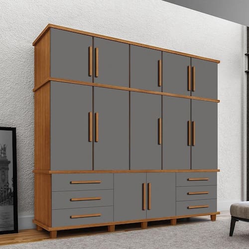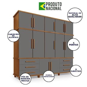 Guarda Roupa Londres 5 Portas 6 Gavetas Com Sapateira - Carvalho New/CinzaO Guarda Roupa Londres é fabricado em MDP 15mm, pés de madeira, gavetas com corrediças telescópicas e cabideiro de alumínio. possui material de alta qualidade, além de seu visual oferecer bom gosto para a decoração do seu espaço.CaracterísticasTipo: Guarda RoupaModelo: LondresCor: Carvalho New/CinzaDimensões do ProdutoAltura: 245cmLargura: 230cmComprimento: 53,5cmObservaçãoImagens Interna do Produto Corresponde Ao Modelo e Não a CorNecessita de Montagem (Fica por Conta do Cliente)Imagens Meramente IlustrativasGuarda Roupa Londres 5 Portas 6 Gavetas com Sapateira - Carvalho New/cinza