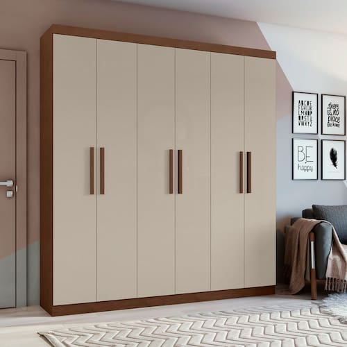 Características: Produto em MDP Pintura U.V. e acabamento em micro textura Puxadores em MDF 06 portas com dobradiças metálicas de 26mm Espaço para roupas longas Interno diferenciado com 09 prateleiras Maleiro sem divisória Gavetas com corrediças telescópicas Gavetas com distanciadores em MDF Cabideiro em alumínio Espaço para sapatos.
