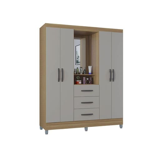 Guarda Roupa Madri 4 Portas 3 Gavetas Poquema Damasco/off White Guarda Roupa Madri 4 Portas 3 Gavetas Poquema O Guarda Roupa Madri e uma peca essencial para qualquer quarto, oferecendo amplo espaco para organizar e armazenar suas roupas e acessorios. Com 4 portas e 3 gavetas, este guarda-roupa e ideal para casais ou para quem precisa de muito espaco de armazenamento. Caracteristicas do Produto Fabricado em MDP 12 mm, garantindo durabilidade e resistencia. Portas com dobradicas metalicas, permitindo uma abertura e fechamento suave e duradouro. Gavetas com corredicas metalicas, facilitando o acesso e a organizacao de seus pertences. Puxadores de plastico, proporcionando um toque moderno e pratico. Espelho, permitindo que voce se arrume e se veja com facilidade. 01 Cabideiro, ideal para pendurar roupas, casacos e acessorios. Pes de plastico, evitando danos ao piso e garantindo estabilidade. Acabamento em pintura , assegurando uma superficie lisa e resistente. Montagem: O produto e entregue desmontado. A montagem e de responsabilidade do cliente. Cor: A cor do produto na foto pode variar de acordo com o monitor utilizado. Decoracao: Os objetos de decoracao apresentados na foto sao meramente ilustrativos e nao estao incluidos no produto. Limpeza: Para limpar o produto, utilize um pano umido e seco, sem produtos abrasivos.