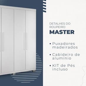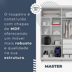 Guarda Roupa Master 4 portas é produzido em 100% MDF que garante a vida útil muito maior. Contém 4 portas e 8 prateleiras e nichos que acomodam suas roupas com maior conforto. Contém 3 gavetas espaçosas com corrediças telescópicas que garante suavidade e durabilidade. Cabideiro em alumínio, puxadores madeirados na cor do produto e pés inclusos.
