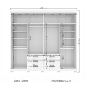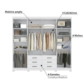 Características - Branco - Estrutura: MDP - Acabamento: Pintura UV Touch/ Ecobril - 8 Portas - 4 Espelhos (95x23cm cada) - Maleiro amplo - 6 Gavetas - Corrediças Metálicas - 6 Nichos - 4 Cabideiros em alumínio - Puxadores em alumínio - Com pés - Peso suportado por gaveta: 3 kg - Peso suportado por prateleira: 8 kg - Produto entregue desmontado - Marca: Santos Andirá