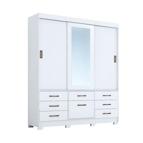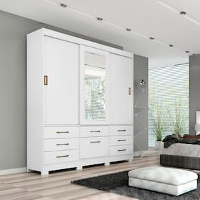 Guarda Roupa 100% MDF, com divisórias internas pensadas para uma perfeita organização. As portas de correr oferecem um ganho de espaço no ambiente e ainda os tornam mais elegantes e práticos. Uma das portas contém espelho e os puxadores são em ABS. Os acessórios são de qualidade superior, roldanas com regulagem para pisos desnivelados e rolamento para deslize suave em trilho de alumínio. Suas 7 gavetas contam com corrediças metálicas telescópicas, os cabideiros são em alumínio com suportes metálicos. Contém espaço para guardar sapatos e 8 pés em ABS inclusos. Acabamento da Prateleira: Verniz Escala de Brilho da Prateleira: Brilhante Possui Cabideiros: 02 Acabamento da Gaveta: Verniz Escala de Brilho da Gaveta: Brilhante Material do Puxador da Gaveta: ABS Possui Organizador de Gaveta: Não Acabamento da Porta: Verniz Escala de Brilho da Porta: Brilhante Material do Puxador da Porta: ABS Acabamento dos Pés: Pintura Acompanha Cama Auxiliar: Acompanha Colchão: Altura da Cama: Altura do Espelho: 119,2 Altura do Espelho 01: Altura do Espelho 02: Altura do Espelho 03: Altura do Espelho 04: Altura do Espelho 05: Altura do Espelho 06: Altura dos Pés: 5 Ambiente: Quarto Ambiente Principal: Quarto Cama Auxiliar Acompanha Colchão: Cama Auxiliar Suporta Até (kg): Cama Suporta Até (kg): Complexidade da Montagem: Alta: deve ser montado por um montador especializado Cor: Branco Cor do Produto: Branco Cor Flex: Cor Interna: Branco Escala de Brilho: Brilhante Espessura do Espelho: 3 Fita Integrada: Formato do Espelho: Retangular Gaveta com Chave: Não Guarda-Roupa Suporta Até (kg): 60 Informações Complementares: Itens Inclusos: 1 Guarda Roupa, Kit Ferragens e Manual de Montagem Largura da Cama: Largura do Espelho: 45 Largura do Espelho 01: Largura do Espelho 02: Largura do Espelho 03: Largura do Espelho 04: Largura do Espelho 05: Largura do Espelho 06: Linha ou Coleção: Luiza Manual de Especificação Técnica: Manual de Montagem e Instalação: https://cdn2.madeiramadeira.com.br/tecnico/panan-moveis/322774-roupeiro-luiza-3-portas-slide.pdf Material da Gaveta: MDF Material da Porta: MDF Material da Prateleira: MDF Material dos Pés: ABS Material Principal: MDF Montagem Flex: Necessita Montagem: Sim Origem do Produto: Nacional Peso: 135 Peso Máximo por Gaveta: 5 Peso Máximo por Prateleira: 10 Possui Calceiros: Não Possui Espaço para Vestidos Longos: Possui Espelho: Sim Possui Espelho Interno: Possui Ganchos: Possui iluminação: Possui Painel de TV: Possui Pés: 08 Possui Portas: 03 Possui Prateleiras: 01 Possui Sapateira: Sim Profundida de Cama: Quantidade de Espelho: 01 Recomendações de Uso, Manutenção e Limpeza: Limpar com pano levemente umedecido em seguida flanela seca. Não aplicar qualquer produto de limpeza ou cera. Sapatas Niveladoras: Não Sistema de Montagem: Parafusos, cavilhas e minifix. Tamanho do Colchão Indicado (L x C): Tamanho do Colchão Indicado Cama Auxiliar: Tamanho do Espelho (A x L): 119,2cm x 45cm Tipo de Corrediça da Gaveta: Metálica Telescópica Tipo de Dobradiça/Corrediça da Porta: Metálica Tipo de Estrado: Tipo de Fixação do Espelho: Parafusos Tipo de Gaveta: Externa Tipo de Guarda-Roupa: Solteiro Tipo de Madeira Maciça: Tipo de Madeira Maciça da Gaveta: Tipo de Madeira Maciça da Porta: Tipo de Madeira Maciça da Prateleira: Tipo de Madeira Maciça do Puxador da Gaveta: Tipo de Madeira Maciça do Puxador da Porta: Tipo de Madeira Maciça dos Pés: Tipo de Puxador da Gaveta: Externo Tipo de Puxador da Porta: Externo