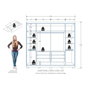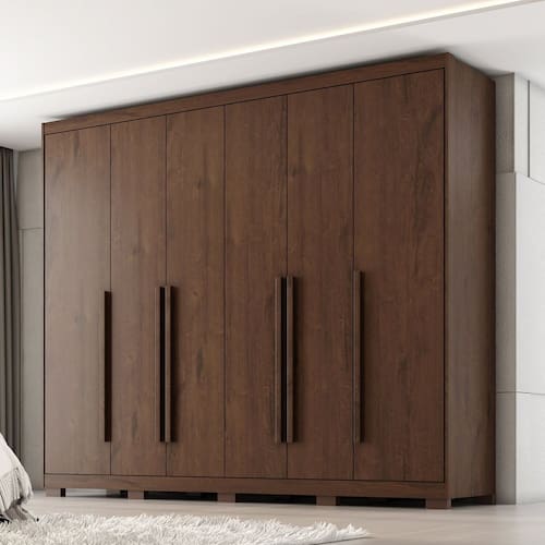 Roupeiro Platinium MDF 6P 6G - Praticidade e Elegância para Seu Quarto! O Roupeiro Platinium MDF 6P 6G é 100% em MDF, oferecendo alta durabilidade e resistência. Com 6 portas equipadas com dobradiças metálicas, garante fácil acesso e fechamento suave. Suas 6 gavetas com corrediças telescópicas proporcionam organização prática e eficiente. O roupeiro conta com 7 prateleiras, 2 calceiros metálicos, 2 cabideiros metálicos e maleiro, garantindo amplo espaço para todos os seus itens. Os puxadores de MDF e os 10 pés de plástico conferem um design moderno e elegante. Com acabamento interno igual ao externo, ele combina beleza e funcionalidade para o seu ambiente. Acabamento da Prateleira: Pintura Texturizada UV Escala de Brilho da Prateleira: Fosco Acabamento da Gaveta: Pintura Texturizada UV Escala de Brilho da Gaveta: Fosco Possui Organizador de Gaveta: Não Acabamento da Porta: Pintura Texturizada UV Escala de Brilho da Porta: Fosco Material do Puxador da Porta: MDF Altura dos Pés: 5 cm Altura Máxima dos Pés: 5.0000 Ambiente Principal: Quarto codigo_ean: 7900288202680 Complexidade da Montagem: Alta: deve ser montado por um montador especializado Cor: Jacarandá Cor do Produto: Jacarandá Cor Interna: Jacaranda Escala de Brilho: Fosco Espessura da Estrutura (mm): 12 mm Espessura das Portas (mm): 15 mm Espessura das Prateleiras (mm): 12 mm Espessura do Fundo (mm): 3 mm Espessura do Fundo das Gavetas (mm): 3 mm Gaveta com Chave: Não Guarda-Roupa Suporta Até (kg): 67 kg Informações Complementares: Fabricado com painéis de madeira reflorestada e certificada. Roupeiro 100% MDF Itens Inclusos: 1 Guarda-Roupa, Kit Ferragens e Manual de Montagem Linha ou Coleção: Platinium Manual de Montagem e Instalação: https://product-hub-prd.madeiramadeira.com.br/674149753/documents/def864ad-acfa-41c3-a46c-45e3e1c814d83092166573817532992243608.pdf Marca: Zanzini Material da Gaveta: MDF Material da Porta: MDF Material da Prateleira: MDF Material dos Pés: Plástico Material Principal: MDF modular: Não Montagem Flex: Não Necessita Montagem: Sim Nicho com Cabideiro: Não Origem do Produto: Nacional Peso: 183 kg Peso Máximo por Gaveta: 3 kg Peso Máximo por Prateleira: 5 kg Porta Janelada: Não Possui Calceiros: 02 Possui Capelinha: Não Possui Espaço para Vestidos Longos: Não Possui Espelho: Não Possui Espelho Interno: Não Possui Ganchos: Não Possui iluminação: Não Possui Nichos: Não Possui Painel de TV: Não Possui Penteadeira: Não Possui Pés: 10 Possui Portas: Sim Possui Prateleiras: Sim Possui Sapateira: Não Produto Montado: Sim Quantidade de Cabideiros: 02 Cabideiros Quantidade de Gavetas: 06 Gavetas Quantidade de Prateleiras: 07 Prateleiras Recomendações de Uso, Manutenção e Limpeza: Limpar com flanela ou pano macio seco, não utilizar produtos abrasivos, desengordurantes, álcool ou qualquer outro produto químico. Não expor o produto diretamente à luz solar e à umidade Sapatas Niveladoras: Não Sistema de Montagem: Parafusos auto atarraxantes, cola, cavilhas, pregos Tipo de Corrediça da Gaveta: Metálica Telescópica Tipo de Dobradiça/Corrediça da Porta: Metálica Tipo de Gaveta: Interna Tipo de Guarda-Roupa: Casal Tipo de Puxador da Gaveta: Não Possui Tipo de Puxador da Porta: Externo