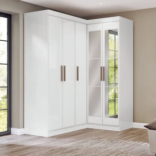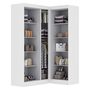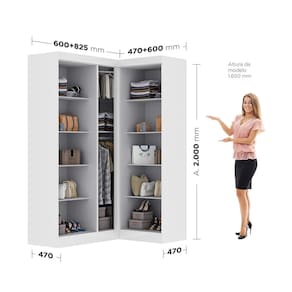 Esta modulação conta com um módulo de canto, dois módulos Paris de 2 portas, todos com amplo espaço interno muito bem dividido, com prateleiras funcionais para melhor aproveitamento, cabideiros em madeira e modulação versátil para roupas longas.