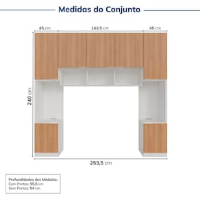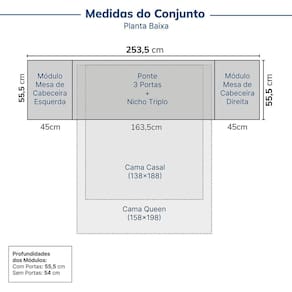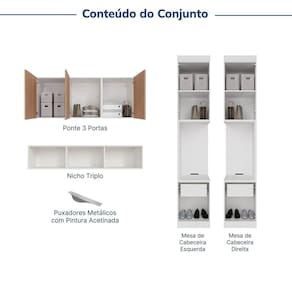 O Guarda Roupa Modulado 7 Portas 4 peças Cabeceira Hera CabeCasa foi desenvolvido para trazer a experiência de ter seu móvel customizado de acordo com a necessidade do seu espaço. O conjunto conta com Dois modulos de Mesa de Cabeceira, uma ponte 3 portas e um Nicho Triplo. Com essa proposta, CabeCasa oferece para seus clientes a possibilidade prática e custo-benefício em oferecer uma linha de modulados que faça a função de um móvel planejado. O cliente pode escolher entre os módulos disponíveis, em diferentes variações de acabamentos, os que mais se adaptam ao seu gosto e ao seu dia a dia. Além disso, conta com design moderno que irá trazer muito mais sofisticação e aconchego para a decoração.! Acabamento da Prateleira: Pintura Escala de Brilho da Prateleira: Semi-Fosco Possui Cabideiros: Não Acabamento da Gaveta: Pintura Escala de Brilho da Gaveta: Semi-Fosco Possui Organizador de Gaveta: Não Acabamento da Porta: Finish Foil Escala de Brilho da Porta: Semi-Fosco Material do Puxador da Porta: Metal Altura dos Pés: 11 Altura Máxima dos Pés: 11.0000 Ambiente Principal: Quarto codigo_ean: 7909903827550 Complexidade da Montagem: Alta: deve ser montado por um montador especializado Cor: Branco Geada/Louro/Cinza Cor do Produto: Branco Geada/Louro/Cinza Cor Interna: Branco Geada Escala de Brilho: Semi-Fosco Gaveta com Chave: Não Itens Inclusos: 02 Módulo de Mesa de Cabeceira, 01 Ponte 3 Portas, 01 Nicho Triplo Linha ou Coleção: Hera Manual de Montagem e Instalação: https://product-hub-prd.madeiramadeira.com.br/925519/documents/995d842c-7856-4375-8a34-d1687d3418f82165166489017217638631838.pdf Material da Gaveta: MDP Material da Porta: MDP Material da Prateleira: MDP Material dos Pés: MDP Material Principal: MDP Medida de Cada Item: Ponte 3 Portas: 163,5cmx55,5cmx68cm. Nicho Triplo: 163,5cmx40cmx34cm. Módulo Mesa de Cabeceira: 45cmx55,5cmx240cm. modular: Sim Montagem Flex: Por ser modulado pode ser montado de acordo com a preferência do cliente. Necessita Montagem: Sim O Módulo Pode ser utilizado individualmente: Sim Origem do Produto: Nacional Peso: 213,49 kg Peso Máximo por Gaveta: 5 kg Peso Máximo por Prateleira: 10 kg Possui Calceiros: Não Possui Espelho: Não Possui Pés: Rodapé Possui Portas: Sim Possui Prateleiras: Sim Produto Montado: Sim Quantidade de Gavetas: 02 Gavetas Quantidade de Prateleiras: 02 Prateleiras Recomendações de Uso, Manutenção e Limpeza: Deve ser realizada com pano limpo e seco. Sistema de Montagem: Cavilha, Parafuso e Minifix. Tipo de Corrediça da Gaveta: Metálica Telescópica Tipo de Dobradiça/Corrediça da Porta: Metálica Tipo de Gaveta: Interna Tipo de Guarda-Roupa: Modulado Casal Tipo de Puxador da Gaveta: Não Possui Tipo de Puxador da Porta: Externo