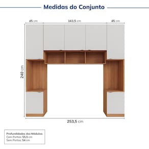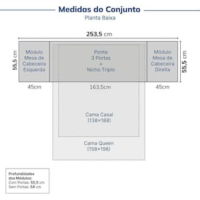 O Guarda Roupa Modulado 7 Portas 4 peças Cabeceira Hera CabeCasa foi desenvolvido para trazer a experiência de ter seu móvel customizado de acordo com a necessidade do seu espaço. O conjunto conta com Dois modulos de Mesa de Cabeceira, uma ponte 3 portas e um Nicho Triplo. Com essa proposta, CabeCasa oferece para seus clientes a possibilidade prática e custo-benefício em oferecer uma linha de modulados que faça a função de um móvel planejado. O cliente pode escolher entre os módulos disponíveis, em diferentes variações de acabamentos, os que mais se adaptam ao seu gosto e ao seu dia a dia. Além disso, conta com design moderno que irá trazer muito mais sofisticação e aconchego para a decoração.! Acabamento da Prateleira: Finish Foil Escala de Brilho da Prateleira: Semi-Fosco Possui Cabideiros: Não Acabamento da Gaveta: Finish Foil Escala de Brilho da Gaveta: Semi-Fosco Possui Organizador de Gaveta: Não Acabamento da Porta: Pintura Escala de Brilho da Porta: Semi-Fosco Material do Puxador da Porta: Metal Altura dos Pés: 11 Altura Máxima dos Pés: 11.0000 Ambiente Principal: Quarto codigo_ean: 7909903827581 Complexidade da Montagem: Alta: deve ser montado por um montador especializado Cor: Louro/Branco Geada/Preto Cor do Produto: Louro/Branco Geada/Preto Cor Interna: Louro Escala de Brilho: Semi-Fosco Gaveta com Chave: Não Itens Inclusos: 02 Módulo de Mesa de Cabeceira, 01 Ponte 3 Portas, 01 Nicho Triplo Linha ou Coleção: Hera Manual de Montagem e Instalação: https://product-hub-prd.madeiramadeira.com.br/925522/documents/ad087a98-c1e4-4e48-b1fc-a9da2fd1b5182165229489017217641949799.pdf Material da Gaveta: MDP Material da Porta: MDP Material da Prateleira: MDP Material dos Pés: MDP Material Principal: MDP Medida de Cada Item: Ponte 3 Portas: 163,5cmx55,5cmx68cm. Nicho Triplo: 163,5cmx40cmx34cm. Módulo Mesa de Cabeceira: 45cmx55,5cmx240cm. modular: Sim Montagem Flex: Por ser modulado pode ser montado de acordo com a preferência do cliente. Necessita Montagem: Sim O Módulo Pode ser utilizado individualmente: Sim Origem do Produto: Nacional Peso: 213,228 kg Peso Máximo por Gaveta: 5 kg Peso Máximo por Prateleira: 10 kg Possui Calceiros: Não Possui Espelho: Não Possui Pés: Rodapé Possui Portas: Sim Possui Prateleiras: Sim Produto Montado: Sim Quantidade de Gavetas: 02 Gavetas Quantidade de Prateleiras: 02 Prateleiras Recomendações de Uso, Manutenção e Limpeza: Deve ser realizada com pano limpo e seco. Sistema de Montagem: Cavilha, Parafuso e Minifix. Tipo de Corrediça da Gaveta: Metálica Telescópica Tipo de Dobradiça/Corrediça da Porta: Metálica Tipo de Gaveta: Interna Tipo de Guarda-Roupa: Modulado Casal Tipo de Puxador da Gaveta: Não Possui Tipo de Puxador da Porta: Externo