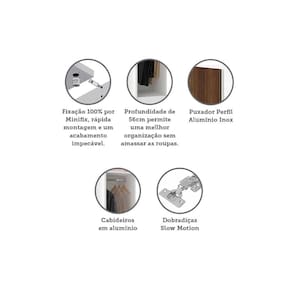 O Guarda Roupa Modulado Prime foi desenvolvido se adequando a vários espaços, de grandes a pequenos. Possui 236 cm de altura oferece divisórias para atender diversas necessidades, profundidade de 56cm possibilitando acomodar roupas sem amassar. Produzido em MDP de 15mm, dobradiças Slowmotin reforçadas em 35mm, a montagem é inteira por minifix que proporciona um acabamento impecável e fundos embutidos com perfil usinado para melhor acabamento e maior resistência.