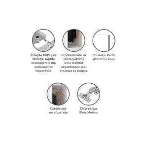 O Guarda Roupa Modulado Prime foi desenvolvido se adequando a vários espaços, de grandes a pequenos. Possui 236 cm de altura oferece divisórias para atender diversas necessidades, profundidade de 56cm possibilitando acomodar roupas sem amassar. Produzido em MDP de 15mm, dobradiças Slowmotin reforçadas em 35mm, a montagem é inteira por minifix que proporciona um acabamento impecável e fundos embutidos com perfil usinado para melhor acabamento e maior resistência.