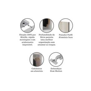 O Guarda Roupa Modulado Prime foi desenvolvido se adequando a vários espaços, de grandes a pequenos. Possui 236 cm de altura oferece divisórias para atender diversas necessidades, profundidade de 56cm possibilitando acomodar roupas sem amassar. Produzido em MDP de 15mm, dobradiças Slowmotin reforçadas em 35mm, a montagem é inteira por minifix que proporciona um acabamento impecável e fundos embutidos com perfil usinado para melhor acabamento e maior resistência.