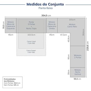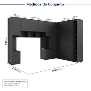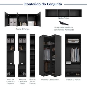 O Guarda Roupa Modulado 11 portas 7 peças Cabeceira Hera CabeCasa foi desenvolvido para trazer a experiência de ter seu móvel customizado de acordo com a necessidade do seu espaço. O conjunto conta com dois módulos de Mesa de Cabeceira, uma Ponte 3 Portas, um Nicho Triplo, um Guarda Roupa de Canto Reto, um Guarda Roupa 2 Portas e um Nicho Vertical. Com essa proposta, CabeCasa oferece para seus clientes a possibilidade prática e custo-benefício em oferecer uma linha de modulados que faça a função de um móvel planejado. O cliente pode escolher entre os módulos disponíveis, em diferentes variações de acabamentos, os que mais se adaptam ao seu gosto e ao seu dia a dia. Além disso, conta com design moderno que irá trazer muito mais sofisticação e aconchego para a decoração.! Acabamento da Prateleira: Pintura Escala de Brilho da Prateleira: Semi-Fosco Possui Cabideiros: Sim Acabamento da Gaveta: Pintura Escala de Brilho da Gaveta: Semi-Fosco Possui Organizador de Gaveta: Não Acabamento da Porta: Pintura Escala de Brilho da Porta: Semi-Fosco Material do Puxador da Porta: Metal Altura dos Pés: 11 Altura Máxima dos Pés: 11.0000 Ambiente Principal: Quarto codigo_ean: 7909903825112 Complexidade da Montagem: Alta: deve ser montado por um montador especializado Cor: Preto Cor do Produto: Preto Cor Interna: Preto Escala de Brilho: Semi-Fosco Gaveta com Chave: Não Itens Inclusos: 02 Módulos de Mesa de Cabeceira, 01 Ponte 3 Portas, 01 Nicho Triplo, 01 Guarda Roupa de Canto Reto, 01 Guarda Roupa 2 Portas e 01 Nicho Vertical Linha ou Coleção: Hera Manual de Montagem e Instalação: https://product-hub-prd.madeiramadeira.com.br/925494/documents/77e55cc6-09e8-4370-83e9-2a03c1f98ffb2164014489017217600131674.pdf Material da Gaveta: MDP Material da Porta: MDP Material da Prateleira: MDP Material dos Pés: MDP Material Principal: MDP Medida de Cada Item: Guarda Roupa 2 Portas: 90cm x 54cm x 240cm. Ponte 3 Portas: 165cm x 54cm x 68cm. Nicho Triplo: 165cm x 40cm x 34cm. Canto Reto: 110cm x 99,5cm x 240cm. Módulo Mesa de Cabeceira: 45cm x 54cm x 240cm. Nicho Vertical: 30cm x 54cm x 240cm. modular: Sim Montagem Flex: Por ser modulado pode ser montado de acordo com a preferência do cliente. Necessita Montagem: Sim O Módulo Pode ser utilizado individualmente: Sim Origem do Produto: Nacional Peso: 512,442 kg Peso Máximo por Gaveta: 5 kg Peso Máximo por Prateleira: 10 kg Possui Calceiros: Não Possui Espelho: Não Possui Pés: Rodapé Possui Portas: Sim Possui Prateleiras: Sim Produto Montado: Sim Quantidade de Gavetas: 06 Gavetas Quantidade de Prateleiras: 11 Prateleiras Recomendações de Uso, Manutenção e Limpeza: Deve ser realizada com pano limpo e seco. Sistema de Montagem: Cavilha, Parafuso e Minifix. Tipo de Corrediça da Gaveta: Metálica Telescópica Tipo de Dobradiça/Corrediça da Porta: Metálica Tipo de Gaveta: Interna Tipo de Guarda-Roupa: Modulado Casal Tipo de Puxador da Gaveta: Não Possui Tipo de Puxador da Porta: Externo