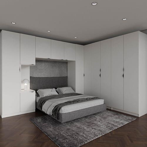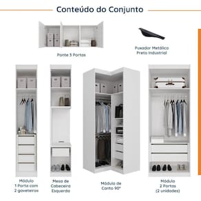 Itens Inclusos: 1 Guarda Roupa 1 Porta, 2 Guarda Roupas 2 Portas, 1 Mesas de Cabedeira, 1 Canto Reto, 1 Ponte 3 Portas, Manual de montagem e Kit ferragens