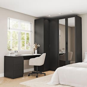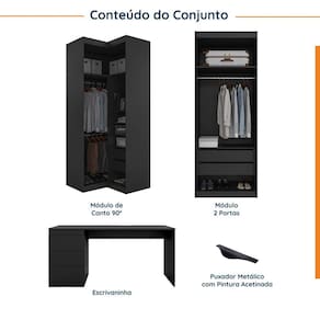 O Guarda Roupa Modulado de Canto 4 portas 3 peças com 02 portas Reflecta e Escrivaninha Hera Cabecasa foi desenvolvido para trazer a experiência de ter seu móvel customizado de acordo com a necessidade do seu espaço. O conjunto conta com módulo de duas portas Reflecta, canto reto e módulo Escrivaninha. Com essa proposta, CabeCasa oferece para seus clientes a possibilidade prática e custo-benefício em oferecer uma linha de modulados que faça a função de um móvel planejado. O cliente pode escolher entre os módulos disponíveis, em diferentes variações de acabamentos, os que mais se adaptam ao seu gosto e ao seu dia a dia. Além disso, conta com design moderno que irá trazer muito mais sofisticação e aconchego para a decoração. Acabamento da Prateleira: Pintura UV Escala de Brilho da Prateleira: Semi-Fosco Possui Cabideiros: 03 Acabamento da Gaveta: Pintura UV Escala de Brilho da Gaveta: Semi-Fosco Possui Organizador de Gaveta: Não Acabamento da Porta: Pintura UV Escala de Brilho da Porta: Semi-Fosco Material do Puxador da Porta: Metal Altura dos Pés: 8 cm Altura Máxima dos Pés: 8.0000 Ambiente Principal: Quarto codigo_ean: 7909903487013 Complexidade da Montagem: Alta: deve ser montado por um montador especializado Cor: Preto Cor do Produto: Preto Cor Interna: Preto Escala de Brilho: Semi-Fosco Gaveta com Chave: Não Itens Inclusos: 1 Guarda Roupas 2 Portas Reflecta, 1 Guarda Roupas de Canto Reto, 1 Escrivaninha, Manual de Montagem e Kit Ferragens Linha ou Coleção: Hera Manual de Montagem e Instalação: https://product-hub-prd.madeiramadeira.com.br/880174/documents/4b0fc1f0-488a-4112-a0a3-0aac498fb0b57580manualheracjto50167359.pdf Material da Gaveta: MDP Material da Porta: MDF/MDP Material da Prateleira: MDP Material dos Pés: MDP Material Principal: MDP Medida de Cada Item: Canto: 240cm x 99,6cm x 101cm; Guarda-Roupas 2 portas: 240cm x 90cm x 54cm; Escrivaninha: 77,2cm x 163cm x 56cm modular: Sim Montagem Flex: Os módulos são individuais, podem ser montados como sugestão da foto ou da forma que melhor couber no seu espaço. Necessita Montagem: Sim O Módulo Pode ser utilizado individualmente: Sim Origem do Produto: Nacional Peso: 321,6 kg Peso Máximo por Gaveta: 3 kg Peso Máximo por Prateleira: 10 kg Possui Calceiros: Não Possui Espelho: Não Possui Pés: Rodapé Possui Portas: Sim Possui Prateleiras: Sim Produto Montado: Sim Quantidade de Gavetas: 07 Gavetas Quantidade de Prateleiras: 03 Prateleiras Recomendações de Uso, Manutenção e Limpeza: Limpar com pano seco e limpo Sapatas Niveladoras: Não Sistema de Montagem: Parafusos, cavilhas e minifix. Tipo de Corrediça da Gaveta: Metálica Telescópica Tipo de Dobradiça/Corrediça da Porta: Metálica Tipo de Gaveta: Interna e Externa Tipo de Guarda-Roupa: Modulado Casal Tipo de Puxador da Gaveta: Embutido Tipo de Puxador da Porta: Externo Ean: 7909903487013