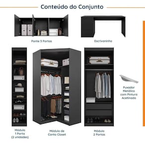 O Guarda Roupa Modulado de Canto 9 portas 5 peças Hera CabeCasa foi desenvolvido para trazer a experiência de ter seu móvel customizado de acordo com a necessidade do seu espaço. O conjunto conta com módulo de uma e duas portas, canto closet, Escrivaninha e ponte 3 portas. Acabamento da Prateleira: Pintura UV Escala de Brilho da Prateleira: Semi-Fosco Possui Cabideiros: Sim Acabamento da Gaveta: Pintura UV Escala de Brilho da Gaveta: Semi-Fosco Possui Organizador de Gaveta: Não Acabamento da Porta: Pintura UV Escala de Brilho da Porta: Semi-Fosco Material do Puxador da Porta: Metal Altura dos Pés: 8 cm Ambiente Principal: Quarto codigo_ean: 7909903402979 Complexidade da Montagem: Alta: deve ser montado por um montador especializado Cor: Preto/Cromado Cor do Produto: Preto/Cromado Cor Interna: Preto Escala de Brilho: Semi-Fosco Gaveta com Chave: Não Informações Complementares: Puxador Metálico Acetinado, portas em chapa de 18mm com dobradiças com amortecimento, gavetas com corrediça telescópica, fundos em 6mm, cabideiros em aço cromado suportando até 10kg e Maleiro até 25kg. Itens Inclusos: 02 Módulos de 01 porta, 01 Módulo de 2 portas, 01 Módulo de Canto Closet, 01 Armário Aéreo de 03 portas e 01 escrivaninha Linha ou Coleção: Hera Manual de Montagem e Instalação: https://product-hub-prd.madeiramadeira.com.br/867412/documents/24540d3b-f42c-4cad-b5c9-30296d266166s5pecascomescrivaninhahera.pdf Material da Gaveta: MDP Material da Porta: MDP Material da Prateleira: MDP Material dos Pés: MDP Material Principal: MDP modular: Sim Montagem Flex: Sim, os módulos vêm separados, podem ser montados de acordo com o ambiente e espaço do cliente. Necessita Montagem: Sim O Módulo Pode ser utilizado individualmente: Sim Origem do Produto: Nacional Peso: 502 kg Peso Máximo por Gaveta: 3 kg Peso Máximo por Prateleira: 10 kg Possui Calceiros: Não Possui Espelho: Não Possui Pés: Rodapé Possui Portas: Sim Possui Prateleiras: Sim Produto Montado: Sim Quantidade de Gavetas: 05 Gavetas Quantidade de Prateleiras: 18 Prateleiras Recomendações de Uso, Manutenção e Limpeza: Utilizar pano seco Sistema de Montagem: Parafusos, Cavilha e Minifix Tipo de Corrediça da Gaveta: Metálica Telescópica Tipo de Dobradiça/Corrediça da Porta: Metálica Tipo de Gaveta: Interna e Externa Tipo de Guarda-Roupa: Modulado Tipo de Puxador da Gaveta: Não Possui Tipo de Puxador da Porta: Externo Ean: 7909903402979