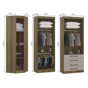 Ambiente composto por: 1 Guarda Roupa Modulado 79cm 2 Portas Paris Luciane Moveis 230 x 79 x 46,5 (Alt x Larg x Prof - cm) 1 Guarda Roupa de Canto Diagonal Modulado 70cm 1 Porta Paris Luciane Moveis 230 x 70 x 70 (Alt x Larg x Prof - cm) 1 Guarda Roupa Modulado 90cm 2 Portas e 4 Gavetas Paris Luciane Moveis 230 x 90 x 46,5 (Alt x Larg x Prof - cm)