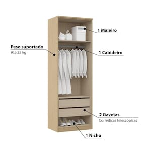 O Guarda Roupa Modulado Elegance é versátil, pois possibilita você acrescentar opções de módulos conforme seu desejo e necessidade. Conta com 2 portas com dobradiças metálicas, 1 nicho, 1 cabideiro, 1 maleiro e 2 gavetas com muito espaço para guardar suas roupas e sapatos. E, se você desejar ampliar esse móvel, bastar comprar e associar outros módulos Elegance ao roupeiro, mas antes, verifique a medida e o desenho do seu espaço para certificação dessa incrível possibilidade.
