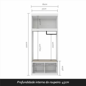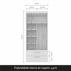 Detalhes Técnicos Medidas do Produto Montado: A: 220cm x L: 160cm x P: 47cm - MDP 15mm e 25mm - Acabamento em Pintura UV - Tonalidade: Branco/Rosa/Linho Bege - Puxadores: MDF 18mm - Cabideiro interno: Alumínio -Cabideiro Externo: Metalon em pintura Epóx preto - Gavetas com Corrediças Metálicas - Prateleiras suportam até 5kg distribuídos - Gavetas suportam até 3kg distribuídos - Puff Baú suporta até 80kg distribuídos - Assento do Puff removível no tecido Linho Bege