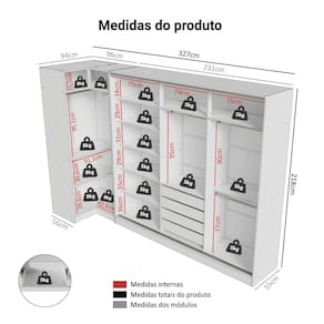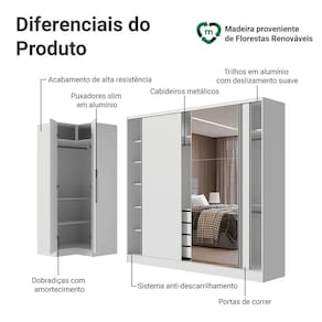 O Guarda-Roupa Royale, por sua vez, é fabricado em 100% em MDF, conta com três portas de correr, sendo uma com espelho que amplia o ambiente e otimiza o espaço. Seu interior é amplo e bem distribuído, com prateleiras, nichos, três cabideiros e quatro gavetas espaçosas, oferecendo capacidade para roupas, acessórios e muito mais.