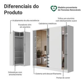 O Guarda-Roupa Royale, por sua vez, é fabricado em 100% em MDF, conta com três portas de correr, sendo duas com espelhos que ampliam o ambiente e otimizam o espaço. Seu interior é amplo e bem distribuído, com prateleiras, nichos, três cabideiros e quatro gavetas espaçosas, oferecendo capacidade para roupas, acessórios e muito mais.