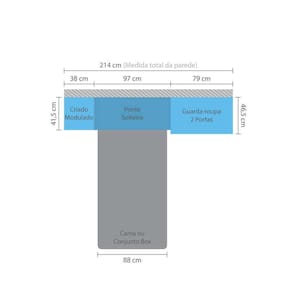 O Dormitório Modulado Master é uma excelente opção para aproveitar o melhor do espaço disponível em seu quarto. Ambiente compacto, ocupa 214cm de parede, porém os módulos podem ser montados separadamente para acomodar da forma que desejar. Conta com um armário ponte com cabeceira para colchão de solteiro com 78cm e 88cm de largura. Contém 1 gaveta e 2 cabideiros para uma perfeita organização.