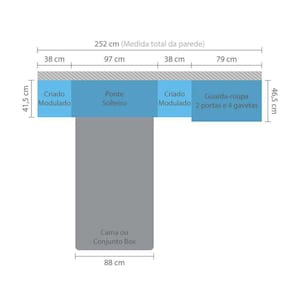 O Dormitório Modulado Master é uma excelente opção para aproveitar o melhor do espaço disponível em seu quarto. Ambiente compacto, ocupa 252cm de parede, porém os módulos podem ser montados separadamente para acomodar da forma que desejar. Conta com um armário ponte com cabeceira para colchão solteiro de 78cm ou 88cm de largura. Gavetas e Cabideiro completam o móvel para uma perfeita organização.