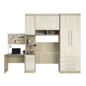 Uma solução elaborada para ambientes compactos. Com largura total de 294cm aproveitando ao máximo o espaço disponível em seu quarto, podendo montar separadamente cada módulo e optar pela disposição da maneira que preferir. Os módulos tem 230cm de altura e 46,5cm de profundidade. O armário ponte pode ser utilizado como maleiro, o Guarda Roupas tem cabideiro e 4 gavetas e o Mesa de Cabeceira Alto com prateleiras e gaveta. Painéis Cabeceiras já inclusos. Escrivaninha com Painel completam o ambiente para estudos.
