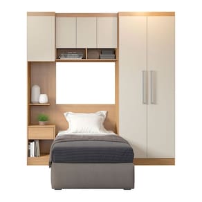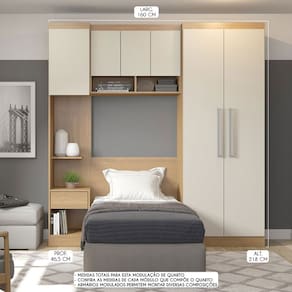CARACTERÍSTICAS TÉCNICAS: - Produzido em MDP de 15 mm - Acabamento UV na cor Carvalho e Champanhe - Porta com Dobradiça Metálica - Gaveta com Corrediça Telescópica - Puxador tipo Alça em ABS na cor Prata - Cabideiro em PVC *Armário com Mesa de Cabeceira pode ser montado em ambos os lados *Painel Cabeceira pode ser utilizado como Painel para TV