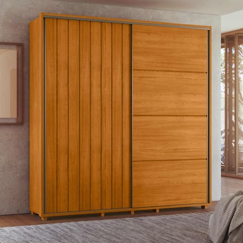 Diferenciais do produto: Acabamento padrão Madetec, Moldura envoltória de 25mm, Portas de correr com amortecimento, Cabideiros extensíveis, Cabideiros de alumínio, Corrediças telescópicas, Puxadores e trilhos em alumínio, Perfis metálicos antiempenamento, Portas com ripado angular.
