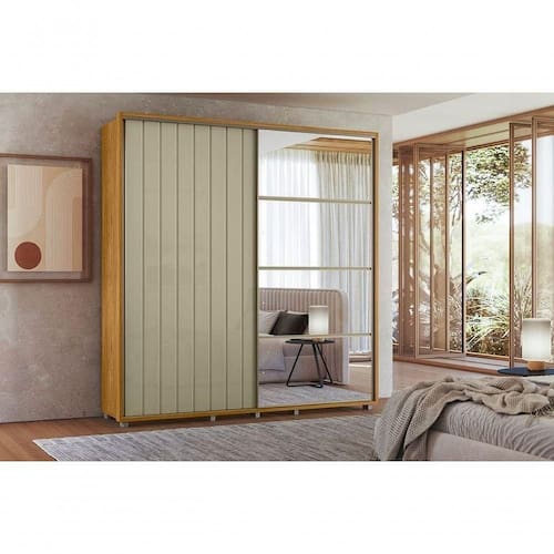 Guarda Roupa Monet Mdf-c/ Espelho-2 Porta De Correr Com Amortecimento-4 Gavetas Com Corrediças Telescópicas O Guarda-roupa Monet combina design e tecnologia para transformar seu ambiente. Suas portas de correr com amortecimento garantem um fechamento suave e silencioso, enquanto os cabideiros extensíveis facilitam o acesso às roupas e otimizam o espaço interno. O ripado angular adiciona um toque de exclusividade, e a moldura envoltória de 25mm valoriza cada detalhe com um acabamento sofisticado. Para completar, suas 4 gavetas com corrediças telescópicas oferecem organização impecável. Com 2,30m de largura, ele se adapta perfeitamente ao seu espaço. 100% MDF Pintura UV Dimensões (L x A x P): 2,300 x 2,400 x 0,605m Acompanha espelhos 4 Gavetas Corrediças telescópicas 2 Portas de correr com amortecimento 2 Puxadores em Alumínio Pés em Poliestireno de 50mm 6 Nichos 8 Prateleiras Moldura envoltória: MDF de 25mm Sistema de montagem Girofix Peso total suportado: 132Kg Garantia: 3 Meses- ATENÇÃO --Montagem por conta do comprador, a não oferece de montagem.**Não nos responsabilizamos pelo em escada e elevadores**Se possuir dúvida, deixe uma pergunta antes de finalizar a compra