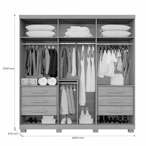 O Guarda-Roupa Moscou e produzido em 100 MDP de 15 mm, garantindo maior vida util e robustez. Com 6 portas e 6 prateleiras, ele oferece espaco para roupas longas e possui moldura frisada com um toque moderno. As 6 gavetas espacosas com corredicas telescopicas e puxadores internos proporcionam suavidade e durabilidade. O cabideiro em aluminio e os pes inclusos completam a funcionalidade e elegancia do Guarda-Roupa.