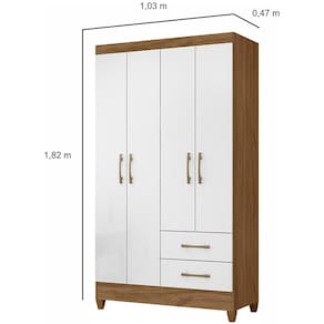 O Guarda-Roupa Moval Chile conta com 4 portas, 2 gavetas externas com corrediças metálicas, puxadores na cor bronze e pés em PVC. Seu espaço interno tem 3 prateleiras (4 divisões) e 1 cabideiro, comportando perfeitamente suas roupas, acessórios e até calçados.
