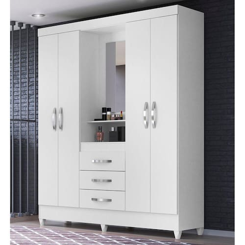 Características Estrutura em MDP de 12mm. Pintura em acabamento UV. 04 Portas articuladas com dobradiças metálicas. Espelho central. 03 Gavetas externas com corrediças metálicas. Cabideiros em alumínio. Amplo espaço interno com prateleiras. Puxadores na cor bronze. Pés em PVC.