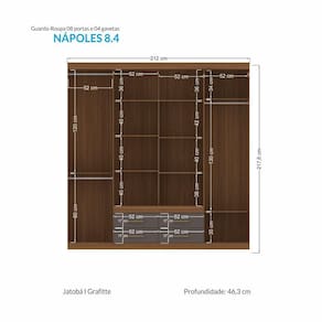 - 08 Portas Com Dobradiças Metálicas - 09 Prateleiras - 03 Cabideiro/Calceiro Eco Frizado Em Alumínio - 04 Gavetas Com Corrediças Metálicas - Amplo Maleiro - Espaço Para Sapatos - Puxadores Em Pvc