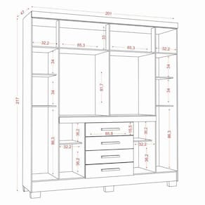 Gavetas amplas com melhor fixacao, proporcionando maior conforto e comodidade em guardar roupas sem amassar e puxar fios. Cabideiro em Aluminio,