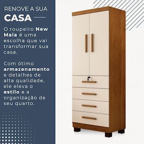 O Guarda Roupa Maia da Benetil e compacto e pratico. Possui bom espaco interno, possibilitando armazenar seus objetos de forma mais organizada. Conta com quatro gavetas, uma delas com chave, oferecendo mais seguranca. As gavetas sao em corredicas telescopicas, o que garante uma maior abertura. As portas de bater dao a ele um ar tradicional, mas com elementos que valorizam cada detalhe. O Cabideiro e em aluminio o que da mais seguranca e resistencia. Ele e compacto. Excelentes para quartos menores.