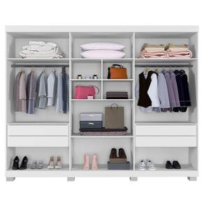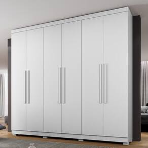Guarda Roupa New Master 6 Portas 4 Gavetas 10 Prateleiras Branco O Guarda-Roupa New Master 6 portas e produzido em chapa de 15 mm que garante a vida util muito maior. Contem 6 portas e 10 prateleiras e nichos que acomodam suas roupas com maior conforto. Contem 4 gavetas espacosas com corredicas telescopicas que garante suavidade e durabilidade. cabideiro em aluminio, puxadores madeirados e pes inclusos. Sua fabricacao utiliza a linha mdp perffect, que une a sustentabilidade a inovacao tecnologica, proporcionando durabilidade e facil limpeza; inspirando sofisticacao ao mobiliario. Sua pintura UV conta com boa resistencia, e facil de limpar e e ecologicamente correto, pois utiliza madeira de reflorestamento, evitando o desmatamento. Caracteristicas: Material principal: mdp Espessura da chapa: 15 mm Escala de brilho: semibrilho Acabamento: Pintura UV Sistema de montagem: parafuso, cavilha e cantoneiras metalicas Quantidade de Portas: 06 Quantidade de Gavetas: 04 Quantidade de Prateleiras: 10