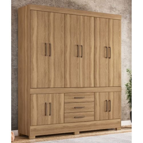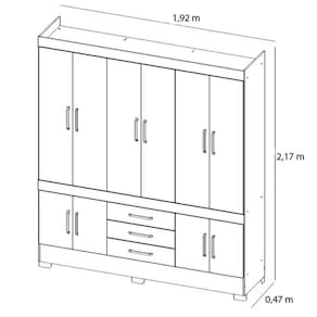 Roupeiro com divisões e compartimento bem distribuídos oferecendo compartimentos exclusivos para vários pares de sapatos, maleiro espaçoso e prateleira. Gavetas externas com deslize perfeito e pés em PVC que facilitam a limpeza do piso ao redor do produto. Puxadores super elegantes na cor bronze.Características:10 Portas3 Gavetas2 PrateleirasCabideirosPés em PVCDimensões:Altura: 217 cmLargura: 192 cmProfundidade: 47 cmPeso: 105 kgVolumes: 2Para garantir a qualidade do produto dentro da embalagem, as caixas são revestidas por um plástico termoencolhível e todas as peças são separadas por isomanta, tudo para preservar e evitar o atrito entre as peças dentro da embalagem. Você contará também com um manual com o passo a passo para auxiliar no momento da sua montagem.