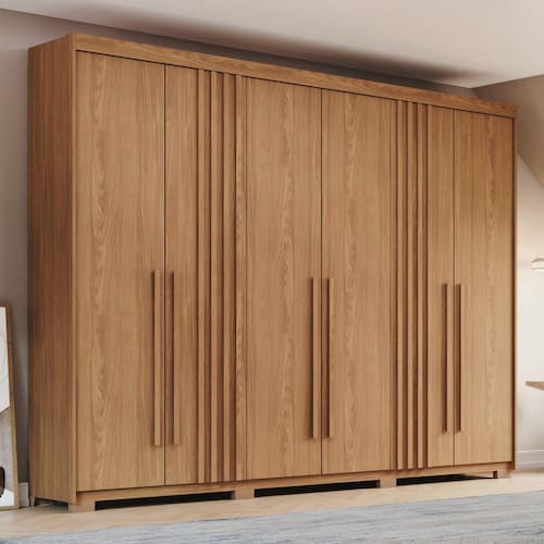 Destacando-se pela qualidade e durabilidade, o Guarda-Roupa Norton apresenta cabideiros em alumínio, proporcionando resistência e suporte adequado para suas peças de vestuário. Suas gavetas contam com corrediças telescópicas, garantindo um deslize suave e facilitando o acesso aos seus pertences. A usinagem especial nas gavetas proporciona uma pega ergonômica, conferindo praticidade ao seu dia a dia. Os puxadores em MDF revestidos e os apliques ripados adicionam um toque de elegância e sofisticação ao design do guarda-roupa. Os pés em ABS garantem estabilidade e segurança, além de proteger o móvel contra possíveis umidades do piso. Se você busca um guarda-roupa que alie funcionalidade, design moderno e durabilidade, o Guarda-Roupa Norton da Henn é a escolha perfeita para complementar o seu ambiente com estilo e praticidade. Transforme seu espaço e desfrute de um móvel que atende às suas necessidades de armazenamento com elegância. Diferenciais; Portas com apliques ripados Gavetas com corrediças telescópicas Gavetas com usinagem para pega Cabideiro e calceiro em alumínio Puxador em MDF revestido Pés em ABS Produto “FLEX”, várias opções de montagem Ripas laterais, frentes e tampos das gavetas na cor da caixa Medidas: A: 2300 x L: 2520 x P: 480 mm Grantia: 90 dias. Recomendação de limpeza: Usa pano levemente umedecido com água, seguido por pano seco. Evitar exposição ao sol, para aumentar a durabilidade da cor do tecido. Não usar escova e/ou produtos abrasivos. Montagem: Montagem, desmontagem e outras instalações serão de responsabilidade do cliente. Não nos responsabilizamos, no ato da entrega, por subir escadas/elevadores ou pelo transporte por guincho em apartamentos. Eventuais despesas são de responsabilidade do comprador; Observações importantes: A tonalidade da cor do produto pode variar de acordo com a sua tela, a iluminação do ambiente ou sua percepção visual Lembrando que são fotos ilustrativas tratadas em estúdios podendo haver pequena diferença nas cores A montagem será de responsabilidade do comprador; Não nos responsabilizamos, no ato da entrega, por subir escadas/elevadores ou transporte por guincho em apartamentos. Eventuais despesas são de responsabilidade do comprador; Confira as dimensões deste produto e certifique-se de que passará normalmente por supostos elevadores, portas, escadas e/ou corredores de sua residência; Para mais informações, acesse nossa Central de Atendimento. Marca: LM DECOR