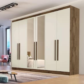 OGuarda Roupa Oslo 6 Portas 4 Gavetas Com Espelho MDF é a perfeita combinação de estilo e funcionalidade. Com uma construção robusta em 100% MDF (Madeira de Reflorestamento) e um acabamento sofisticado em verniz UV, este guarda-roupa traz um toque de classe e uma escala de brilho semi-brilho que realça o design moderno. Com puxadores elegantes em madeira, 6 portas, 4 gavetas e 11 prateleiras, oferece um excelente aproveitamento dos espaços internos, ideal para organizar roupas e acessórios de forma prática. Possui divisões ELE e ELA, e cabideiros em alumínio, você pode manter tudo organizado com facilidade. As gavetas contam com corrediças telescópicas para um deslizar suave, enquanto as dobradiças modernas e reforçadas garantem durabilidade e eficiência.