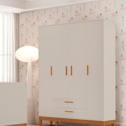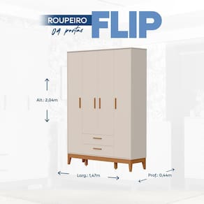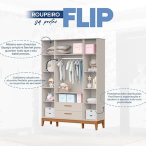 O roupeiro Flip 4 Portas areia, é ideal para futuras mamães que buscam organização, beleza e tranquilidade! Produzido em MDF com pintura UV atóxica, garante segurança para o bebê e alta durabilidade. Seu design funcional facilita o dia a dia e deixa o quarto ainda mais acolhedor.