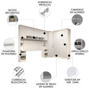 Conteúdo da Embalagem: 1 Guarda Roupa, 1 Canto Oblíquo, 2 Mesas Cabeceira Alta, 1 Armário Aéreo, 2 Painéis Cabeceira.