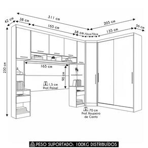 Peso Suportado Distribuído: Guarda Roupa 30Kg/Canto Oblíquo 25Kg/Mesa Cabeceira 15Kg cada/Armário Aéreo 15Kg.