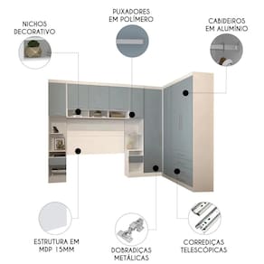 Conteúdo da Embalagem: 1 Guarda Roupa, 1 Canto Reto, 2 Mesas Cabeceira Alta, Sapateira, 1 Armário Aéreo, 2 Painéis Cabeceira.